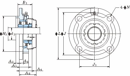 ・UKFCは丸形のフランジおよび取付け面に印ろうを持つ軸受箱で印ろう部を機械本体の取付け穴にはめ込むことで、軸受箱を正確な位置に取付けることが出来ます。