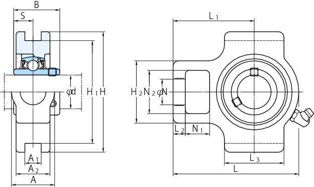 軸受箱 軸受 A A1 A2 H H1 H2 L L1 L2 L3 N N1 N2 B S 呼び番号 基本定格荷重(kN) 係数f0