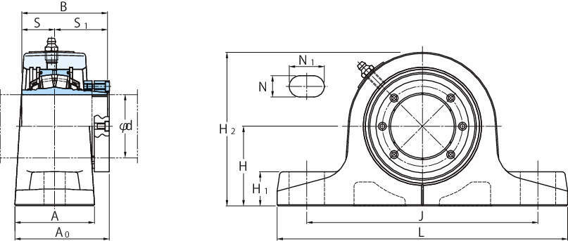 軸受箱 軸受 H L A J N N1 H1 H2 A0 B S S1 呼び番号 基本定格荷重(kN)