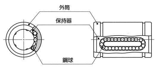 ・軸を軌道とする構造のため、従来のブッシュを使用した案内部を、大幅な設計変更することなく、転がり案内へ変更できます。