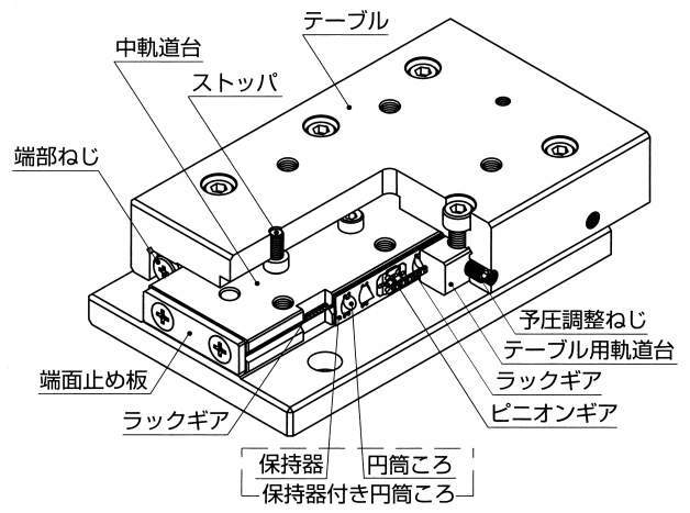 ・取付面は精密な研削仕上げを施しています。また、テーブルにはめねじ、ベッドにはざぐりが施されており、適正な予圧状態にしてありますので、そのまま機械・装置に取り付けるだけで信頼性の高い直線運動が得られます。