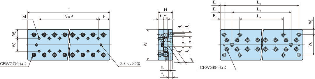 | W | H | L (mm) | t1 (mm) | t2 (mm) | t3 (mm) | W3 (mm) | W4 (mm) | N×P (mm) | E (mm) | M (mm) | W5 (mm) | W6 (mm) | L1 (mm) | E1 (mm) | L2 (mm) | E2 (mm) | L3 (mm) | E3 (mm) | d1 (mm) | d2 (mm) | h1 (mm) | h2 (mm) | |||||||||