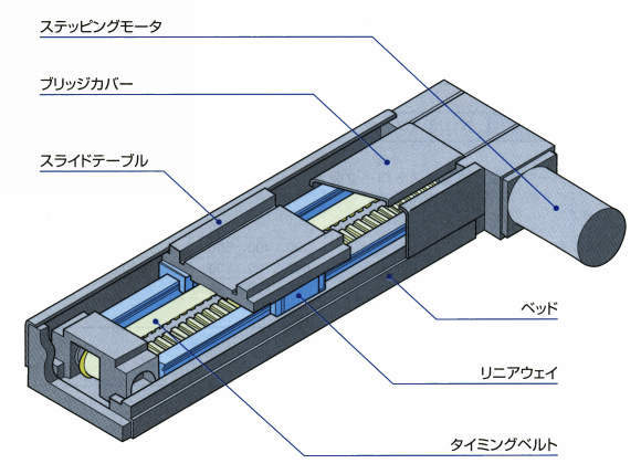 精密位置決めテーブルLBは、スライドテーブルの送り機構に耐久性に優れた高張力スチールコード入りのタイミングベルトを採用し、駆動用モータに高トルク5相ステッピングモータを使用した、高速移動が可能なロングストロークタイプの位置決めテーブルです。