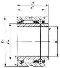 ・ラジアル軸受部に保持器付ニードルベアリングが、スラスト軸受部に三点接触形ボールベアリングが組み合わされた、容積の小さい経済性に富んだ軸受です。