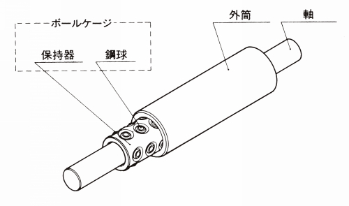 ・円筒状の軌道面をもつ外筒と保持器に組み込んだ鋼球の組合せにより、回転運動と同時に軸方向の往復直線運動が可能です。