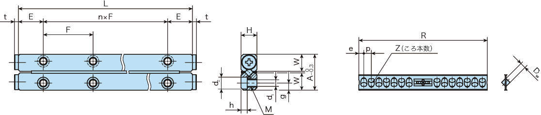 ・この軸受は通常並列で使用するため、軌道台4本・保持器付円筒コロ2本で、1組の販売になります。