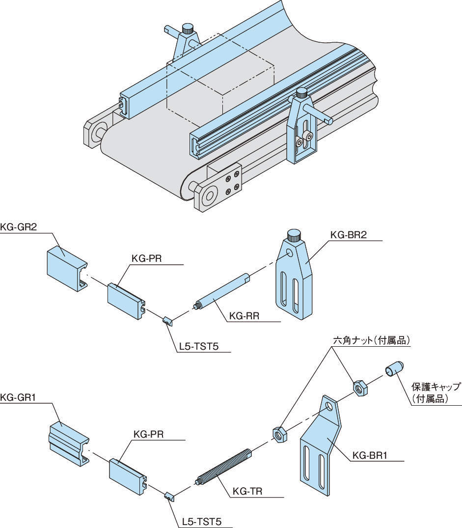 ・搬送用コンベアのワーク脱落防止用ガイドレール、及び取付具を標準化しました。