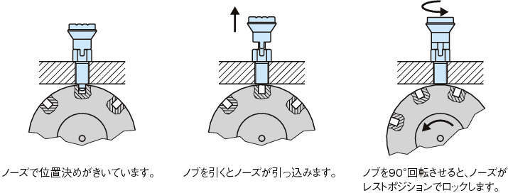 ・ノーズロック型はノブを引いた状態で90°回転するとノーズが引っ込んだ状態でロック(固定)できます。
