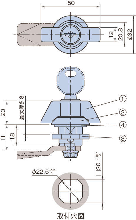| (1)ノブ | 亜鉛ダイキャスト(ZDC1) クロムメッキ |