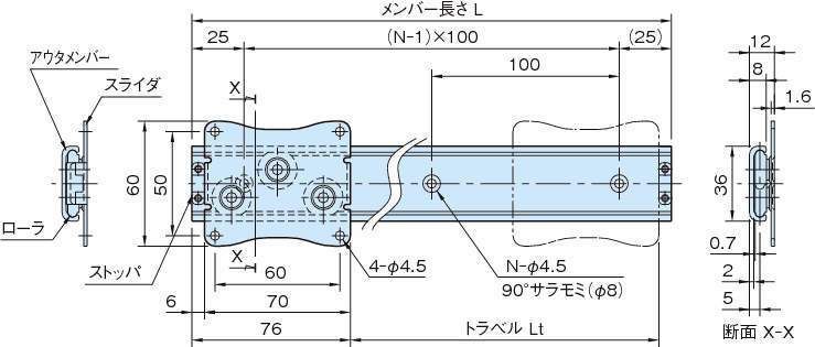 ・アルミ合金製の薄肉・軽量アウタメンバーと樹脂製専用ベアリングを組み合わせた薄形・軽量スライドレールです。