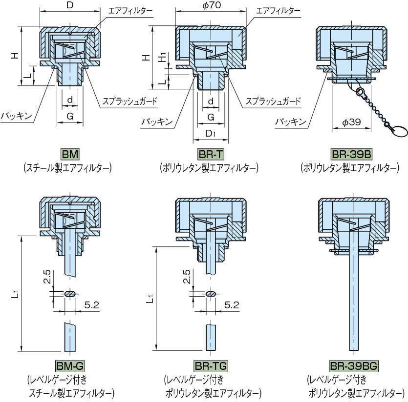 | エアフィルター | BM・BM-G:亜鉛メッキ鉄線(SWMGS-1) ろ過性:50~60μ BR-T・BR-39B・BR-TG・BR-39BG:ポリウレタン ろ過性:40μ |