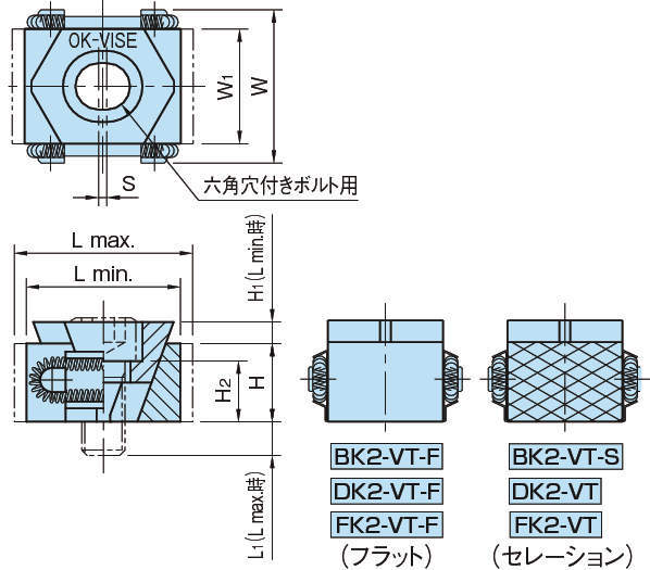 ・V型クサビは、クサビの倍力作用により、六角レンチによる締付けのみで、強いクランプ力を容易に得る事ができます。