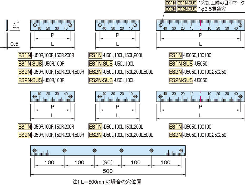 | ES1N-U100L | スケール | 接着タイプ(目印マーク) | アルミ製 | 100 | 90 | 2 | 1.6 |