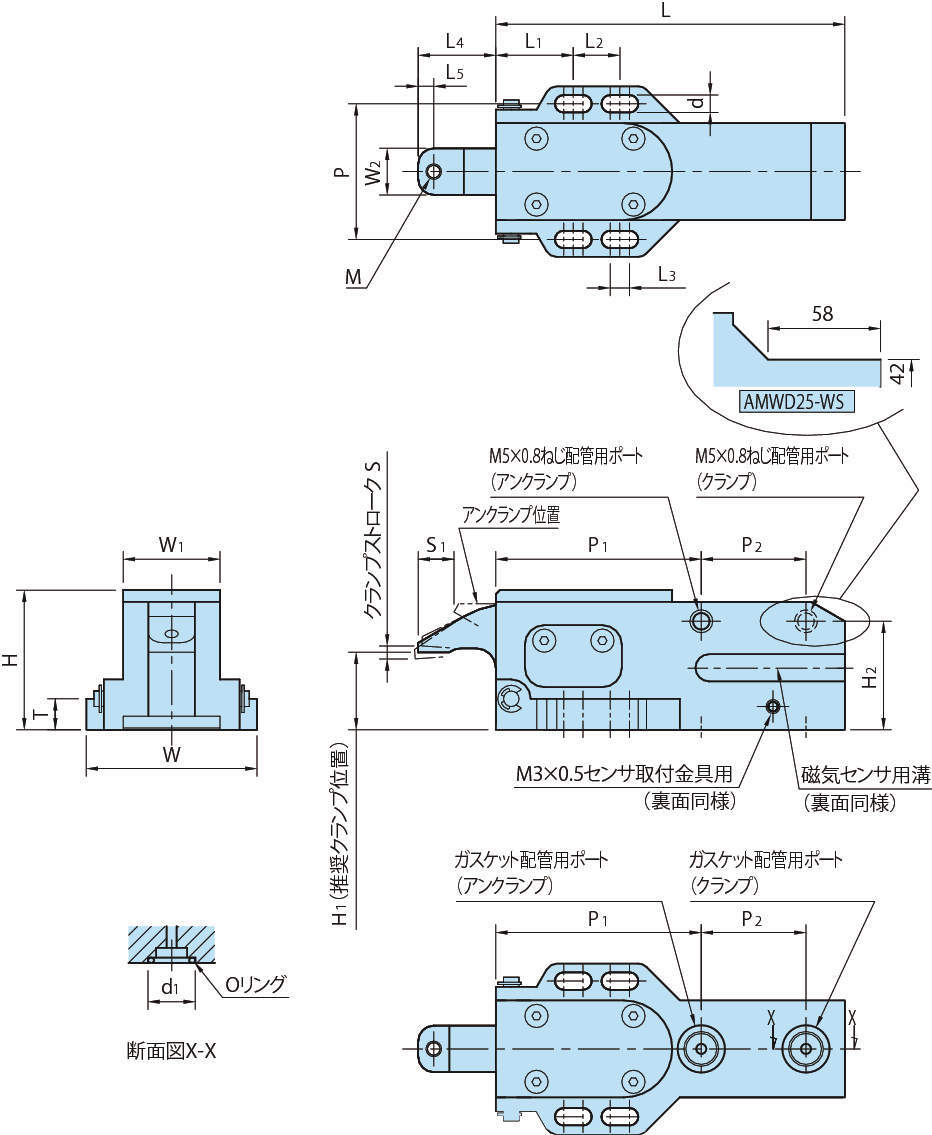 ・クサビ構造により、同サイズのエアシリンダに比べ約1.5倍のクランプ力が得られます。
