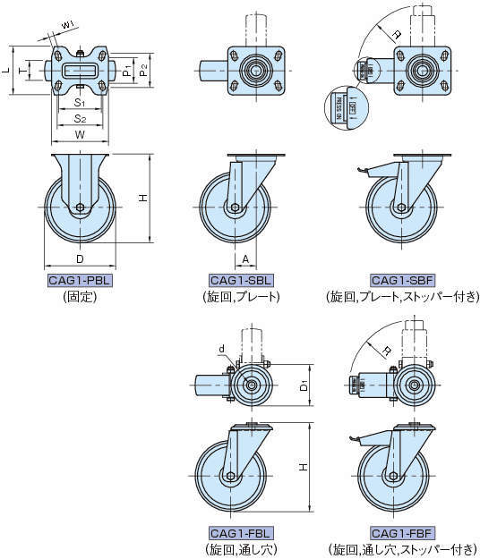 | CAG1-100SBF | 旋回、プレート、ストッパー付き | 100 | 30 | 128 | 9 | 75 | 45 | 80 | 60 | 100 | 85 | - | - | 35 | 120 | 1000 | 850 |