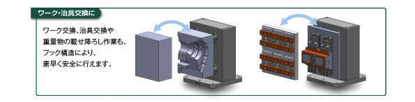 ・ワーク交換m治具交換や重量物の載せ降ろし作業も、フック構造により素早く安全に行えます。