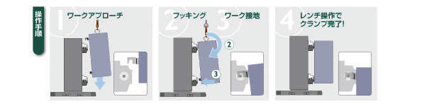 ・ワーク交換m治具交換や重量物の載せ降ろし作業も、フック構造により素早く安全に行えます。