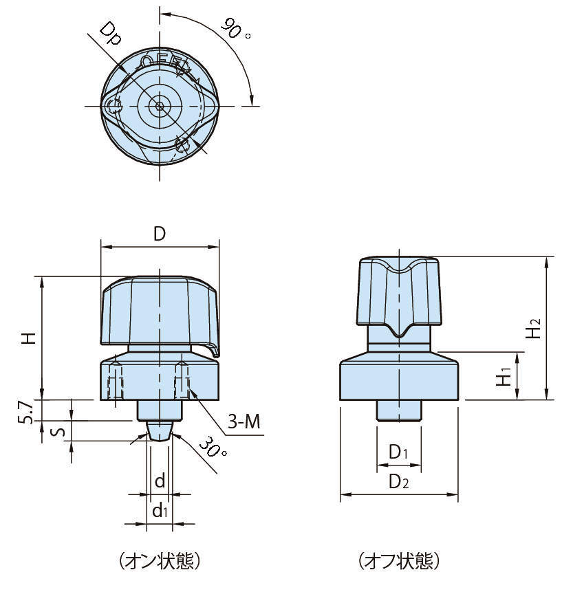 ・本体に施されたマーク(ON、MID、OFF)と、ノブの位置から状態を視認できます。