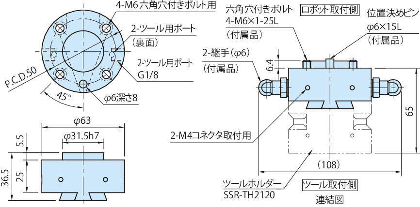 | 付属品 | ・六角穴付きボルト M6×1-25L:4本 ・位置決めピンφ6×15L:1個 ・継手(チューブ径φ6):2個 |