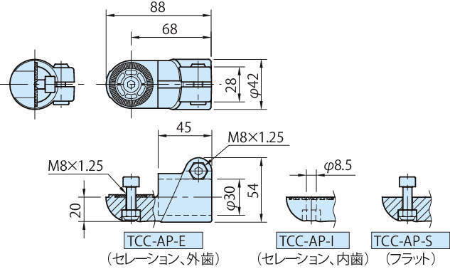 ・「TCC-AP-E」「TCC-AP-I」セレーション(歯数36)タイプは、10°ピッチでの角度調整が可能です。