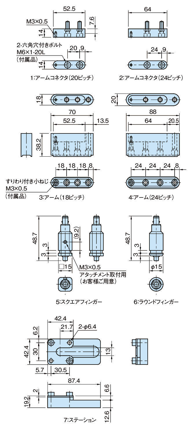 | 付属品 | <FYT-SSA-2> 六角穴付きボルト:M6×1-20L 4本 すりわり付き小ねじ M3×0.5 2本 六角穴付きボルトM6×1-25L(ステーション取付用) 2本 <FYT-SSA-3> 六角穴付きボルト:M6×1-20L 6本 すりわり付き小ねじ M3×0.5 3本 六角穴付きボルトM6×1-25L(ステーション取付用) 2本 |