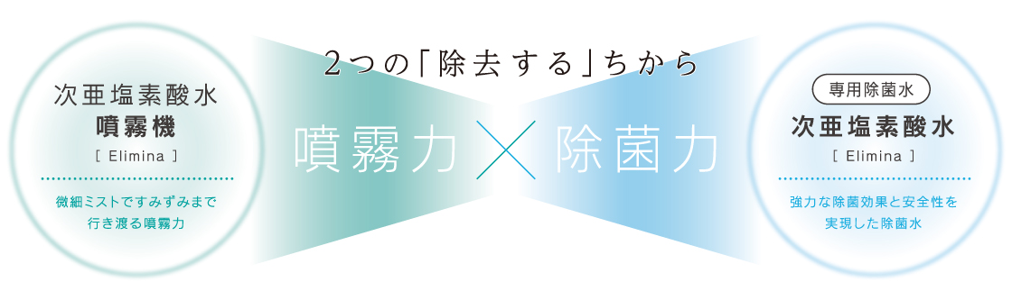 独自開発の超音波ユニットを搭載した噴霧機、強い除菌効果と高い安全性の専用除菌水。エリミーナは、このふたつを掛け合わせることで浮遊・付着するウイルスや菌をしっかりと「除去」し、安心安全な衛生環境を作る事が出来ます。