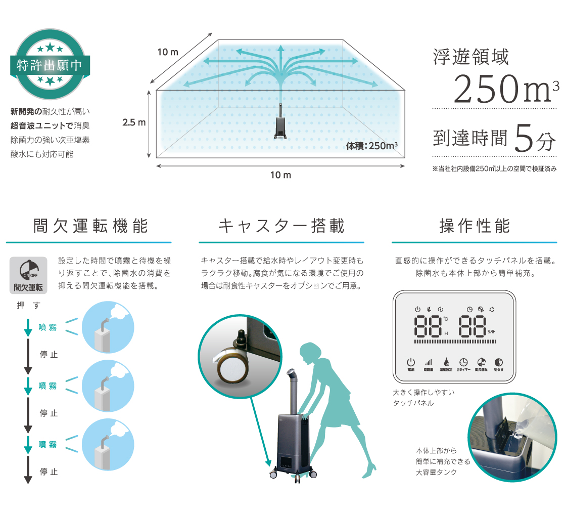 ・新開発の超音波ユニットで高濃度の次亜塩素酸水に対応清潔で安心な環境を