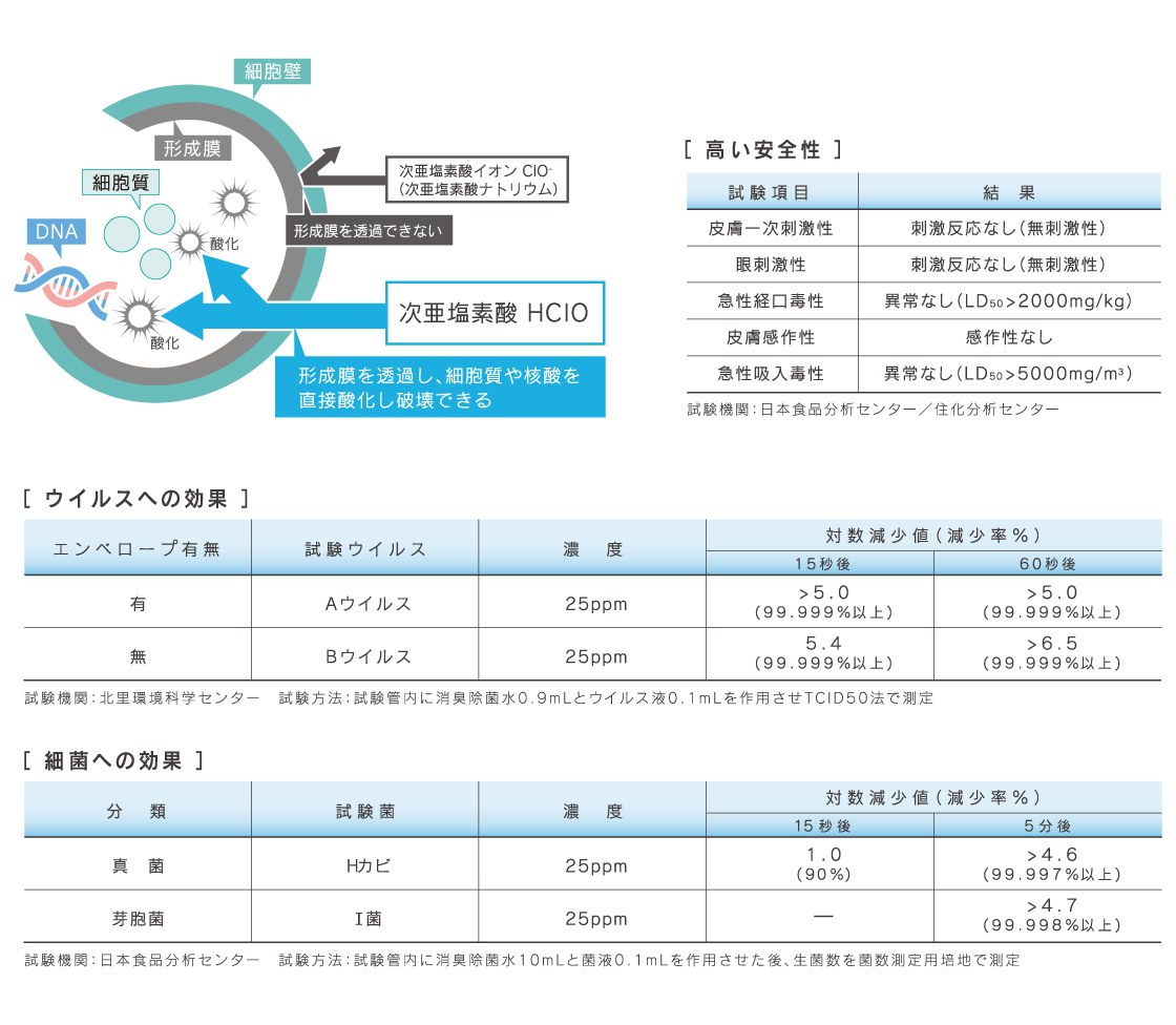 当社の除菌水の主成分は次亜塩素酸(HCIO)であり、菌の形成膜を透過し、