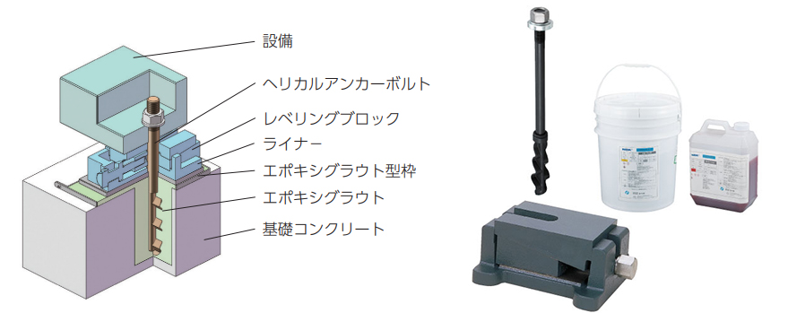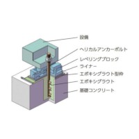 レベリングエレメント、エポキシグラウト、アンカーボルトの3つの基礎部品を組合せ、高精度設備の設置工期の短縮を図るマシンインストレーションシステム。