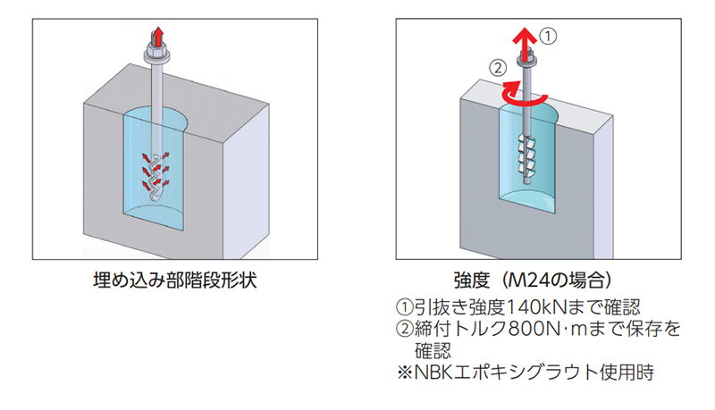 ・埋め込み部を階段形状にすることで、「かかり」を良くし、引抜きや締付に対しても、基礎と機械や装置と強固に締結します。また製品は鍛造品とし、強度の向上を図っています。