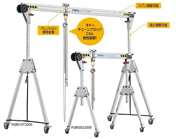 ・キトーポータガントリー「PG standard(スタンダード) type」は、組立て式のアルミ製ポータブルクレーンで、組立・設置がとても簡単!