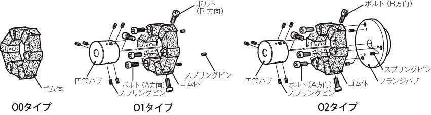 ・このゴム体を円筒ハブとフランジハブにそれぞれ半径方向、軸方向にボルトで結合することで、ゴム体を介した動力伝達が実現します。