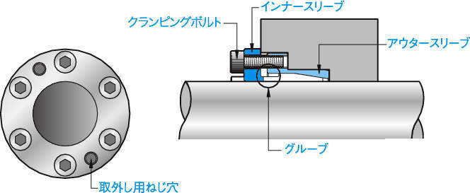 ・インナースリーブに設けたグルーブ(溝)によってくさび効果が増強され、高い伝達トルクが得られます。