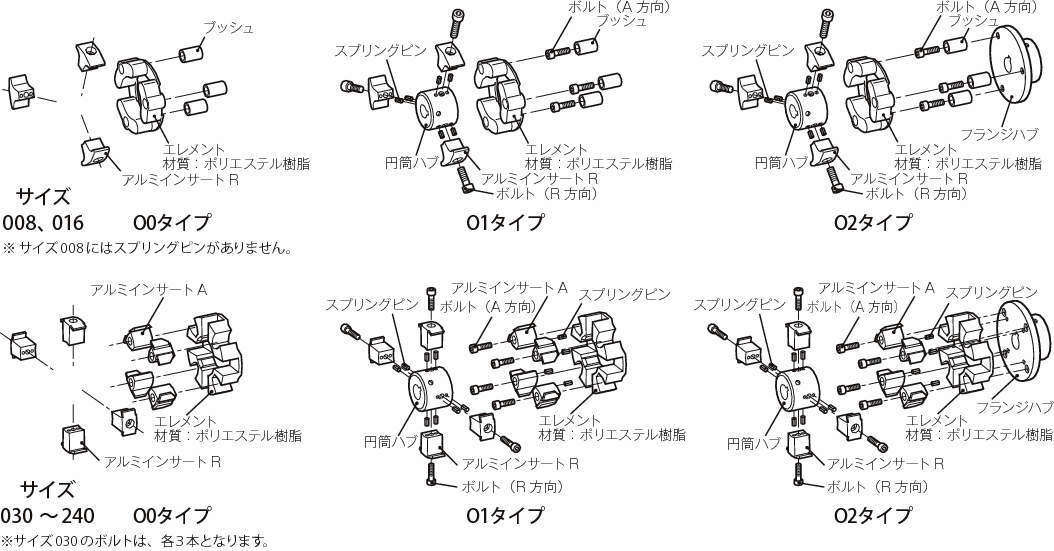 ・動力伝達要素にゴムまたは樹脂を採用したカップリングで、それら伝達要素の弾性を利用して、衝撃や振動を減衰・吸収します。