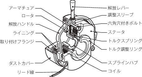 ・トルク調整リングを回すことにより、制動トルクを広範囲に調整できる上、二重制動構造になっているため、最低トルクは確保できます。