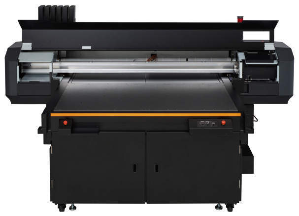 ・ガントリー駆動式のフラットベッドUV-LEDプリンタ。