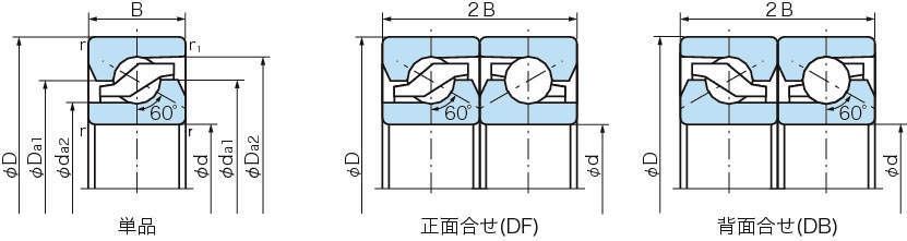 ・DF、DB、DTや、3個以上の組合せなど、いずれにも使えるユニバーサルタイプのフラッシュグラウンド軸受(Uタイプ)です。