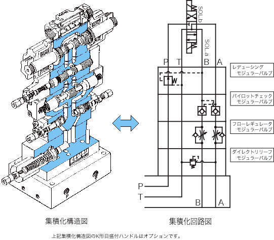 ・モジュラーバルブとは、油圧装置の集積化を目的として開発、設計されたもので、それぞれの機能をもったバルブを積重ねることにより、バルブ間の配管を不要にし、そのまま回路構成ができるようにしたものです。