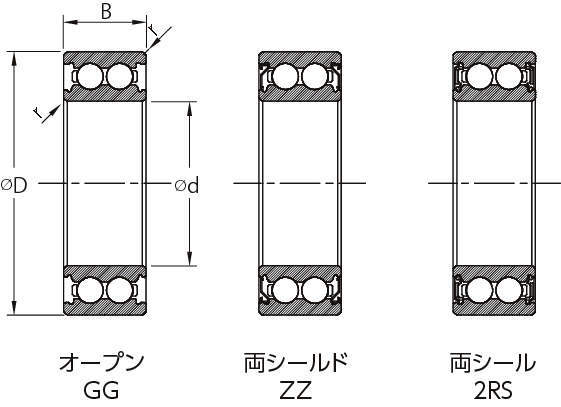 | 材質 | 内外輪:SUJ2 ボール:SUJ2 保持器:S55C シールド:SECC シール:ニトリルゴム |