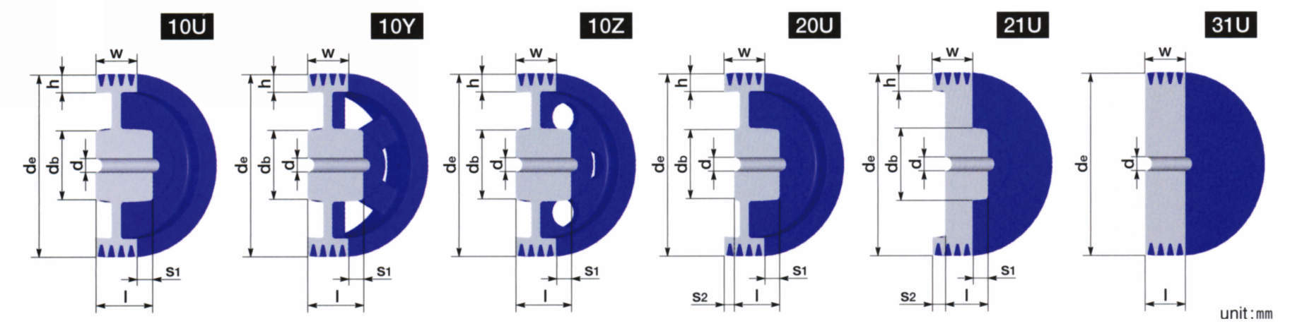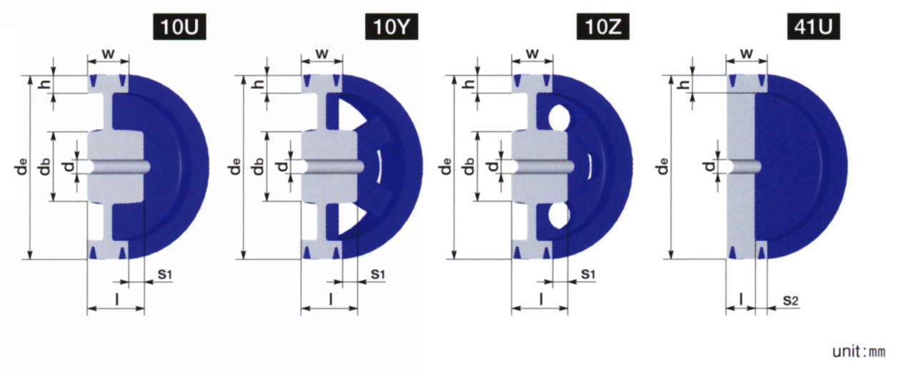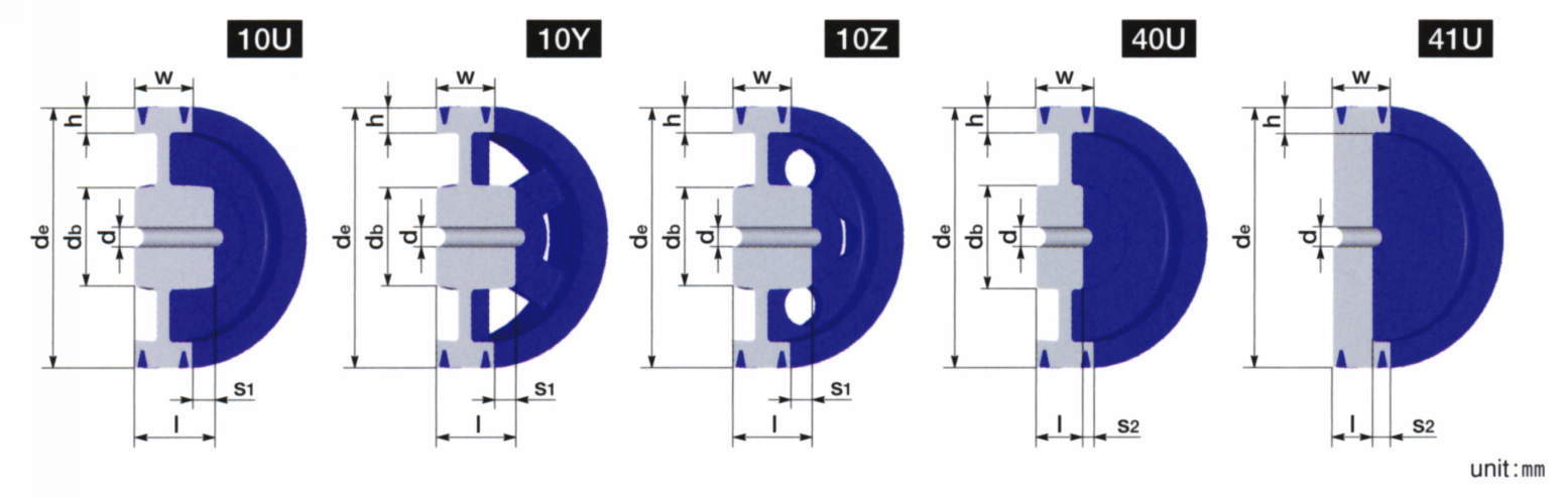 軸穴径d(mm) | 形状図番 | 溝本数 | ハブ (mm) | リム (mm) |