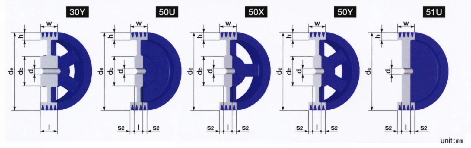 軸穴径d(mm) | 形状図番 | 溝本数 | ハブ (mm) | リム (mm) |