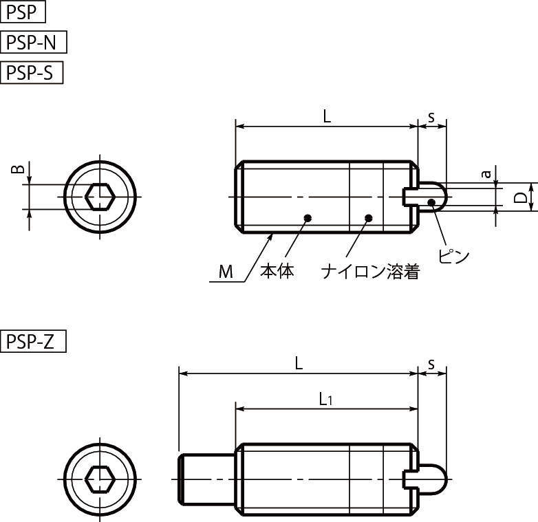 | ピン | PSP:S45C(硬度56~60HRC)、三価クロメート処理 PSP-S・PSP-Z:S45C(硬度56~60HRC)、四三酸化鉄皮膜(黒) PSP-N:ナイロン66(白) |