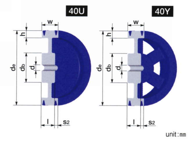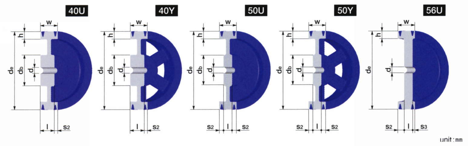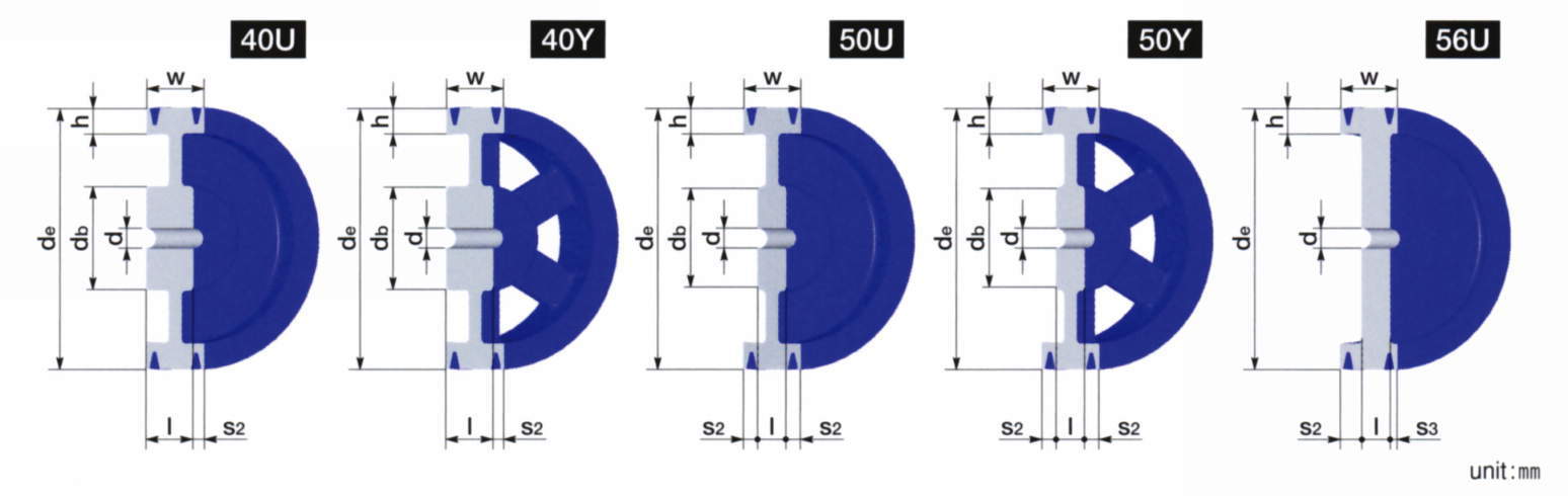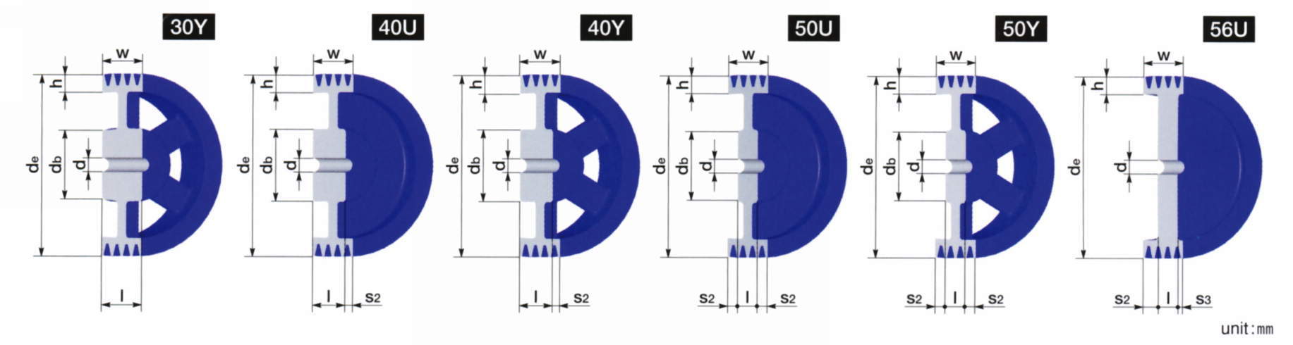 軸穴径d(mm) | 形状図番 | 溝本数 | ハブ (mm) | リム (mm) |