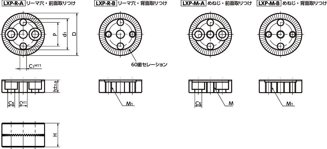 | 型式 | タイプ | 取りつけ方法 | D | d1 | P | C1 | Cs | M1 | H | h | C | M | 歯数 |