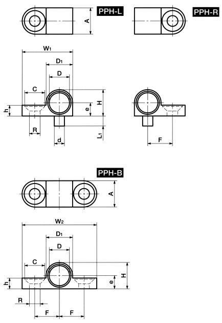 | PPH-8-R | 右片側固定 | 8 | 10.5 | 10.5 | 20 | - | 10.5 | 4.2 | 5.25 | 4 | 4 | 9.5 | 8.3 | 4.3 | PPR-8 | 5 |