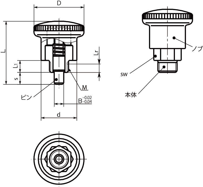 ・ノブを引き、30°回転させれば、ピンを引込めた状態にロックできます。ロックの解除は、ノブをわずかに引き、30°回転させます。内蔵スプリングの力でもとにもどります。