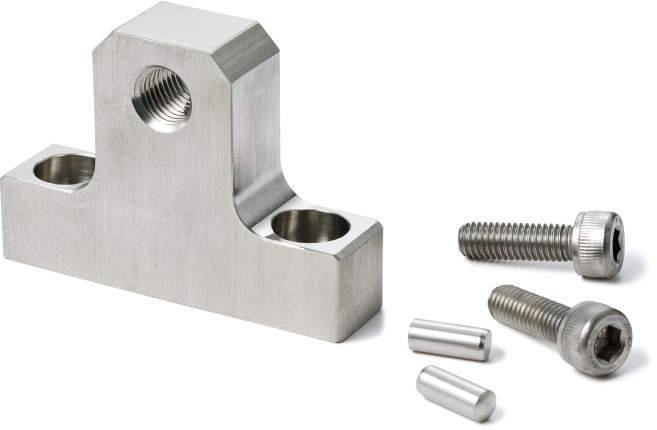 ・ねじ穴(細目)・ノックピン取りつけ穴加工済みのリニアガイド用ストッパ。