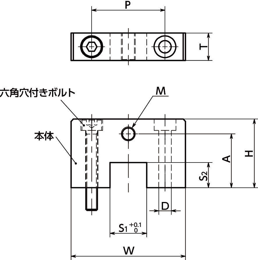 ・ねじ穴(細目)加工済みの門型リニアガイド用ストッパ。レール上部からの取りつけが可能です。