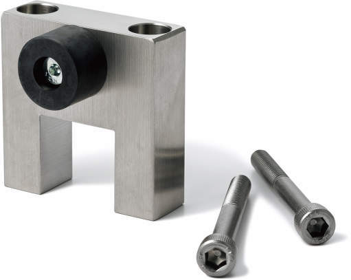 ・ウレタン「NSBU」を組み込んだ門型のリニアガイド用ストッパ。レール上部からの取りつけが可能です。