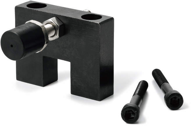 ・ウレタンつきストッパボルト「NSBUH」を組み込んだ門型のリニアガイド用ストッパ。レール上部からの取りつけが可能です。